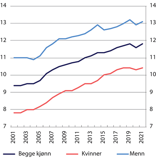Sysselsettingen blant eldre arbeidstakere har økt siden tidlig på 2000-tallet og også etter pensjonsreformen i 2011. I 2020 var det forventet at en 50-åring ville arbeide 12 årsverk etter fylte 50 år, se figur 7.6. Beregninger fra Arbeids- og velferdsdirektoratet viser at forventet yrkesaktivitet etter 50 år har økt med ett årsverk fra 2011 til 2020.