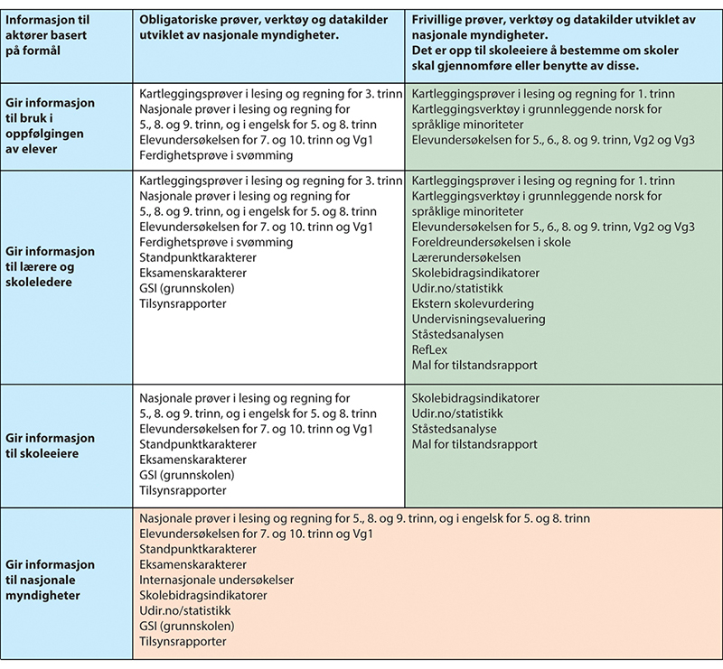 Figur 7.1 viser en oversikt over de obligatoriske og frivillige prøvene, verktøyene og datakildene i dagens kvalitetsvurderingssystem utviklet av eller på oppdrag fra nasjonale utdanningsmyndigheter. Figuren viser også hvem som ut ifra de fastsatte formålene er målgruppene for innholdet. Oversikten viser at det er et mangfold av prøver, verktøy og datakilder i kvalitetsvurderingssystemet og at systemet er omfattende.