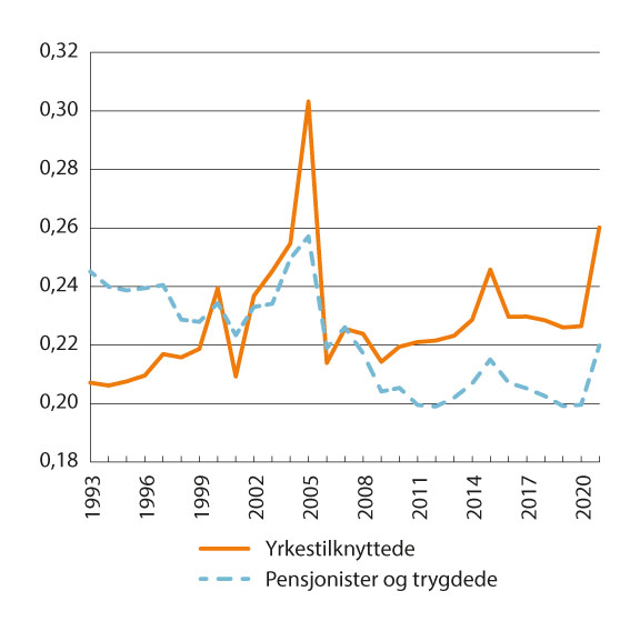 Figur 10.2 viser utviklingen i Gini-koeffisienten i perioden 1993–2021 for yrkestilknyttede og pensjonister/trygdede for inntekt etter skatt. Figuren viser at fordelingen av inntekt både for yrkestilknyttede og pensjonister/trygdede er sterkt preget av store svingninger i perioden rundt 2000, 2006, 2015 og 2021. Dette skyldes i hovedsak tilpasninger til den midlertidige utbytteskatten i 2001, innføringen av utbytteskatt på avkastning utover normalavkastning i 2006 (skjermingsmetoden for aksjonærer), at skattesatsen på skattepliktige aksjeinntekter for personer (utbytte og realiserte aksjegevinster) økte fra 27 til 31,68 prosent fra 2015 til 2019 og økt utbytteskatt i 2022. Gini-koeffisientene for både yrkestilknyttede og pensjonister/trygdede var om lag uendret mellom 2019 og 2020, men økte i 2021. Økningen i Gini-koeffisienten i 2021 må ses i sammenheng med at kapitalinntektene økte med 97 prosent fra 2020 til 2021. Aksjeutbytte økte med 127 prosent og realisasjonsgevinster økte med 80 prosent fra 2020 til 2021. Renteinntekter gikk derimot ned med 37 prosent. Økningen i aksjeutbytte i 2021 må ses i sammenheng med økt skatt på utbytte fra 1. januar 2022. Over tid er det en tendens til at fordelingen blant yrkestilknyttede har blitt noe skjevere, mens fordelingen blant pensjonister/trygdede har blitt jevnere.