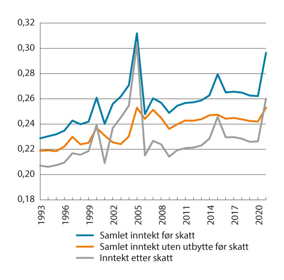 Figur 10.3 viser utviklingen i samlet inntekt før skatt med og uten utbytte og inntekt etter skatt over en lengre tidshorisont, 1993–2021. Figuren viser en betydelig variasjon i Gini-koeffisienten for inntekt før og etter skatt i årene rundt den midlertidige utbytteskatten i 2001, innføringen av ny utbytteskatt fra 2006, økt skattesats på utbytte fra 2016 og 2022. Særlig i årene før 2006 steg Gini-koeffisienten kraftig, mens den falt kraftig fra 2006. Disse endringene henger i stor grad sammen med tilpasninger knyttet til endringer i skattereglene som synliggjør inntekter i skattestatistikken. Særlig i forkant av innføringen av skatt på aksjeinntekter for personer (utbytte og realiserte gevinster) fra 2006 var det gunstig å ta ut kapital fra bedriftene som utbytte og tilbakeføre dette som innskutt kapital. Innskutt kapital kan senere tas ut uten å bli skattlagt på personens hånd. Slike transaksjoner vil i liten grad gi endringer i den reelle fordelingen, men har stor betydning for den målte fordelingen i det aktuelle året.