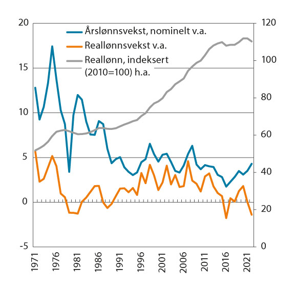 I denne boksen presenteres utviklingen i nominell lønn (årslønn i nasjonalregnskapet, se vedlegg 2) og reallønn1 siden 1970. Den nominelle lønnsveksten var høy på midten av 1970-tallet, med over 17 prosent i 1975. Dette ga en reallønnsvekst på over 5 prosent. Reallønnsveksten var også over 5 prosent i 1971. Til tross for sterk prisvekst på 1970-tallet var veksten i reallønn samlet for dette tiåret forholdsvis sterk. Lavere lønnsvekst i 1979 skyldtes i stor grad innføring av lønns- og prisstopp. På 1980-tallet varierte lønnsveksten mellom 12,0 prosent i 1981 og 4,4 prosent i 1989. Lønnsveksten i 1988 og 1989 var påvirket av inntektsreguleringslover.2 Reallønnsveksten på 1980-tallet sett under ett var lav, og negativ i flere år. Siden begynnelsen av 1990-tallet har både lønns- og prisveksten stort sett vært klart lavere enn på 1970- og 80-tallet, men reallønnsveksten har vært høy. Etter et fall i reallønnen i 2016, bidro høyere nominell lønnsvekst til positiv reallønnsvekst fram til 2020. I 2021 utlignet prisstigningen veksten i nominell årslønn fullt ut. Historisk høye priser førte til en reallønnsnedgang i 2022.
