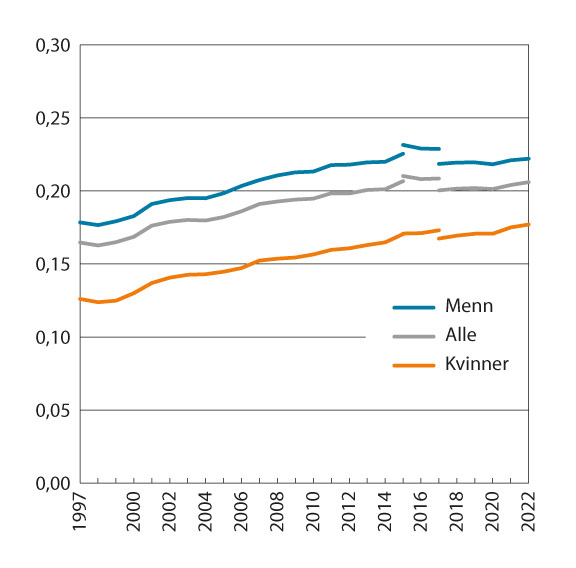 Kvinner | 19 | 19 | 20 | 19 | 19 | 19 | 19 | 19 | 20 | 21 | 20 | 20 | |
