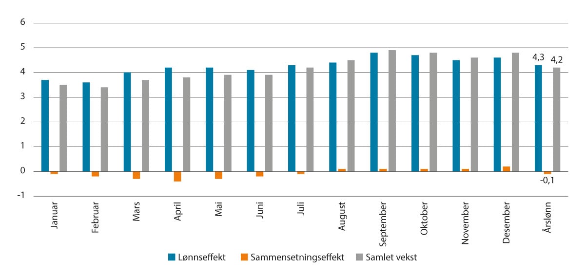 For lønnstakere under ett viser tall fra nasjonalregnskapet at veksten i gjennomsnittlig årslønn fra 2021 til 2022 var 4,3 prosent.