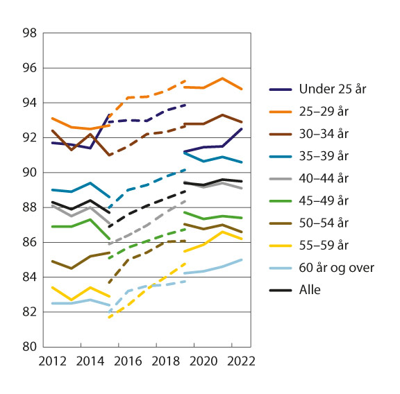 En mye benyttet lavlønnsgrense har vært 85 prosent av gjennomsnittlig industriarbeiderlønn i tariffområdet LO-NHO-området. Dette ville tilsvare 462 995 kroner for et fullt årsverk uten overtid i 2022. Målt slik var 18 prosent av alle heltidsansatte lønnstakere lavtlønte i 2022, jf. tabell 2.17. For kvinner er andelen 20 prosent og for menn 17 prosent. Disse andelene har vært relativt stabile senere år.