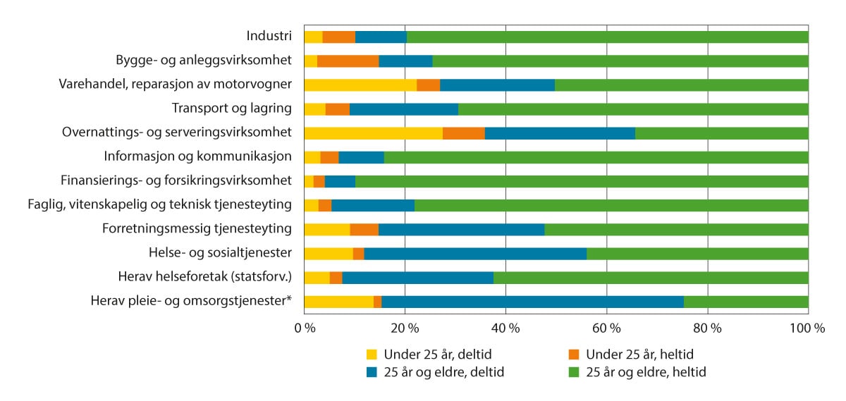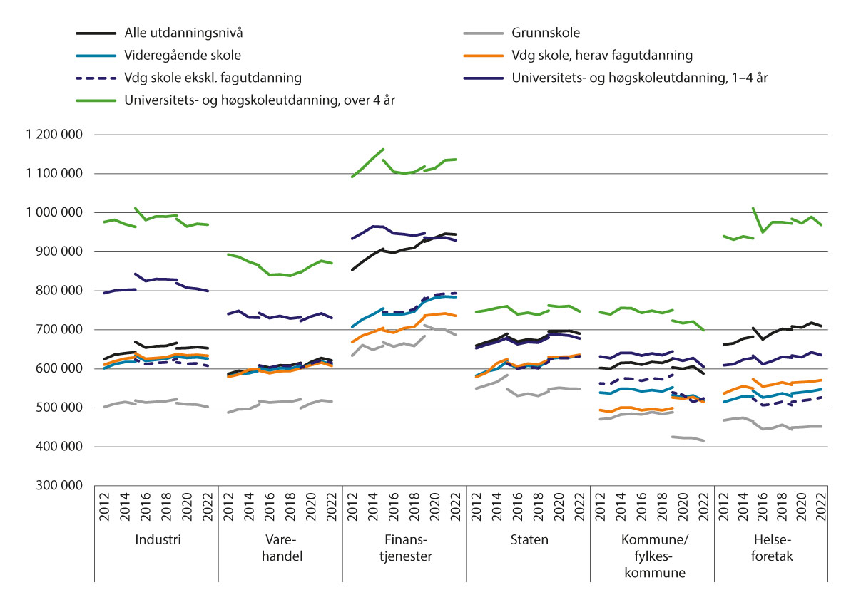 Analysen av lønns- og sammensetningseffekter er her avgrenset til næring.3 Det vil være mange sammensetningseffekter som ikke fanges opp, framstillingen er altså ikke uttømmende. Det kunne også vært relevant å se på andre variabler, som kjønn, utdanning og alder. Bevegelsen av unge lønnstagere inn og ut av arbeidsmarkedet har også påvirket sammensetningseffektene mellom 2021 og 2022. Ifølge en rapport fra SSB er unge med lavt utdanningsnivå en dominerende gruppe blant lønnstakere i jobber med lav lønn,4 og bortfall av unge lønnstakere med lavere betalte jobber vil trekke gjennomsnittlig lønn opp. Effekten er motsatt når disse kommer tilbake i jobb. Se også omtalen av utviklingen i arbeidsmarkedet i kapittel 7. I avsnittene som følger beregnes ikke sammensetningseffekten av akkurat denne endringen, men forskyvninger av jobber mellom næringer vil fange opp noe av dette.