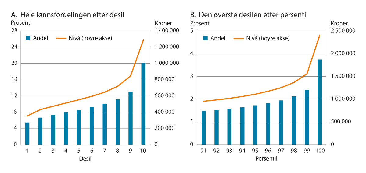 Tabell 2.13 viser en oppsplitting av desil 10 i persentiler. Persentil 100 (prosenten med aller høyest lønn) hadde en gjennomsnittslønn på 2 411 600 kroner og mottok 3,8 prosent av samlet lønn i 2022 (uten lærlinger). Andelen av samlet lønn som prosenten med aller høyest lønn mottok, har økt de siste ti årene. Veksten i gjennomsnittslønn fra 2012 til 2022 var høyere for denne prosenten med aller høyest lønn enn for de andre persentilene.
