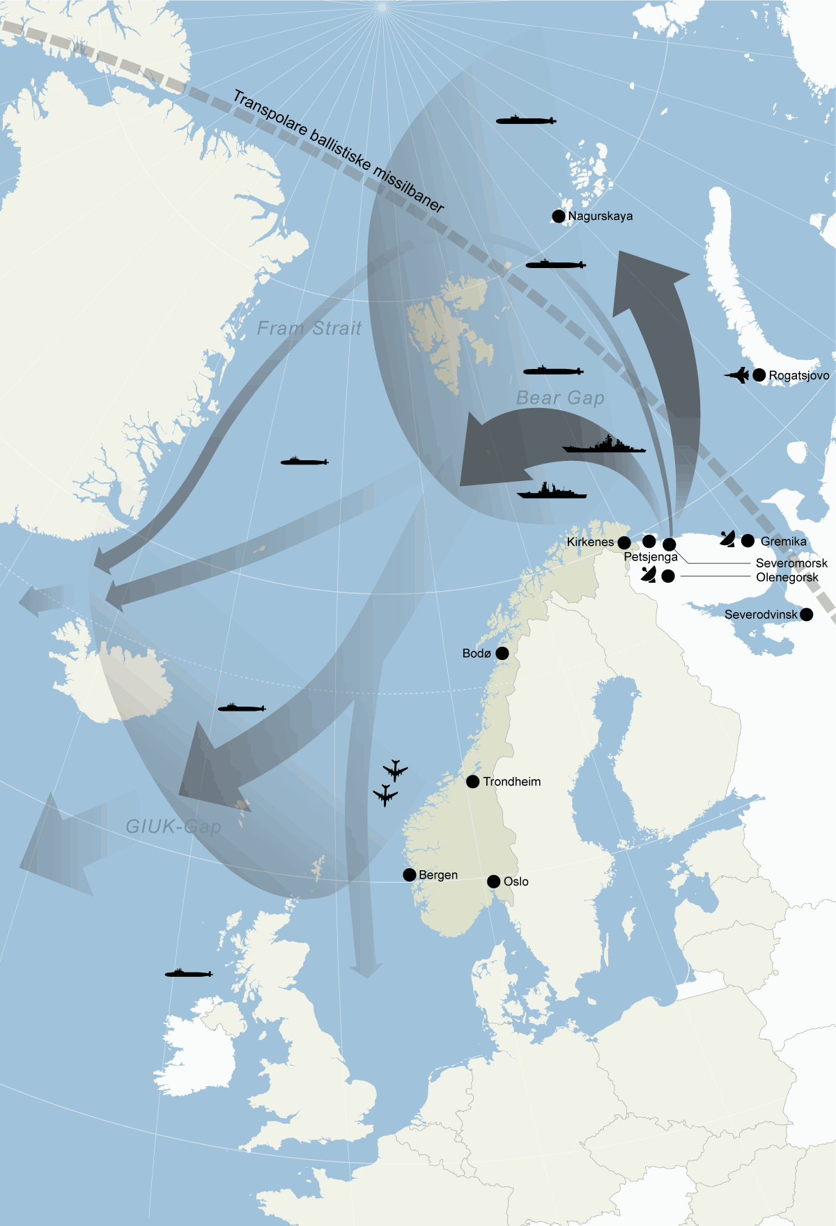 Nordområdenes militærstrategiske betydning for både Russland og NATO vil vedvare og trolig forsterkes kommende år. Den globale spenningen kommer til uttrykk i Arktis og Nord-Atlanteren (Figurene 10.7 og 10.8). Som beskrevet i 4.4 og 10.9 vil Russlands strategiske tyngdepunkt på Kolahalvøya få økt strategisk betydning fordi Østersjøen vil bli dominert av NATO-land. Dette øker viktigheten av adgang til Atlanterhavet for russiske strategiske og taktiske ubåter som operer fra sine baser på Kola. Slik overlapper et russisk ønske om tilgang til Atlanterhavet for undervannsoperasjoner med NATOs behov for sjøkontroll i norske havområder. Denne dynamikken er gjenstand for kontinuerlige operasjoner og høy prioritet blant kjernevåpenstatene på alliert side.