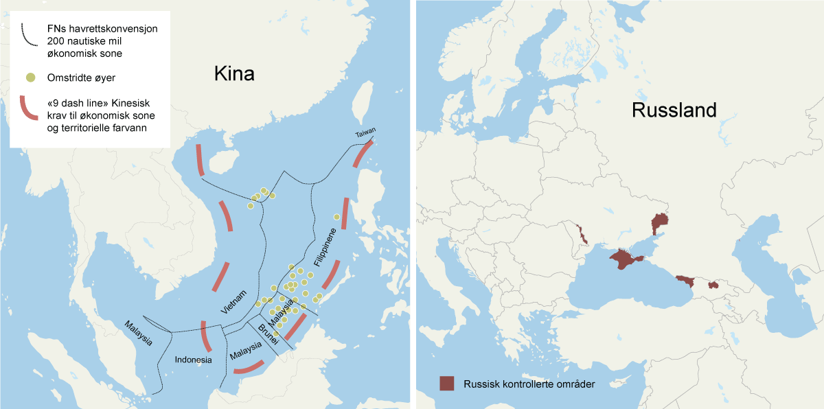 Figur 4.3 Kina og Russland utfordrer begge internasjonale regler for nasjonal suverenitet og selvbestemmelsesrett. Dette er i strid med Norges interesser, som er helt avhengig av internasjonale lover og regler følges. Bildet viser farvann og territorium i henholdsvis Sør-Kinahavet og Svartehavsområdet som Kina og Russland søker å kontrollere i strid med internasjonal lov.