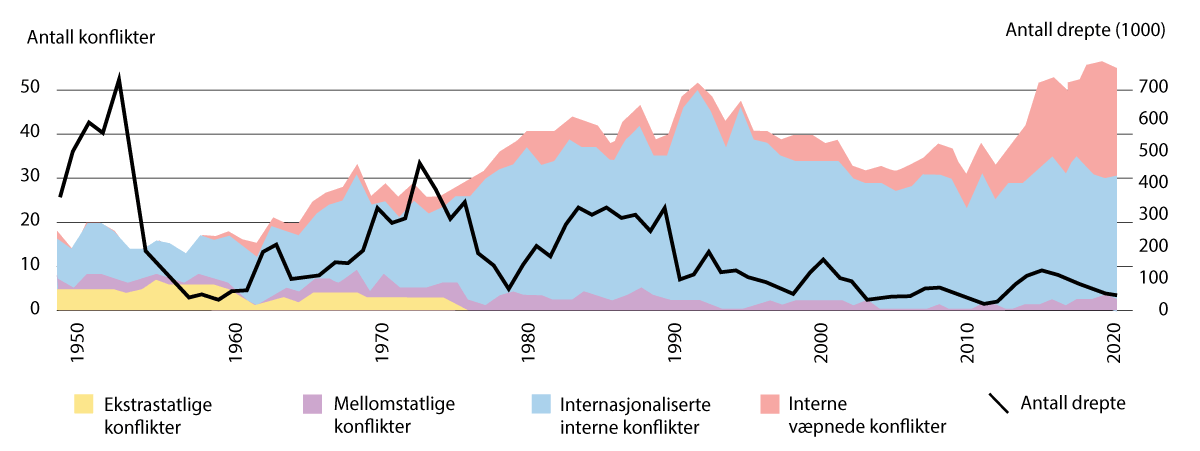 Figur 4.4 Figuren viser hvordan antall konflikter har gått opp de siste årene, men at antallet drepte har vært relativt lavt sammenlignet med andre historiske perioder. Antallet drepte vil gå kraftig opp som følge av Russlands angrep på Ukraina hvor flere hundre tusen er blitt drept.