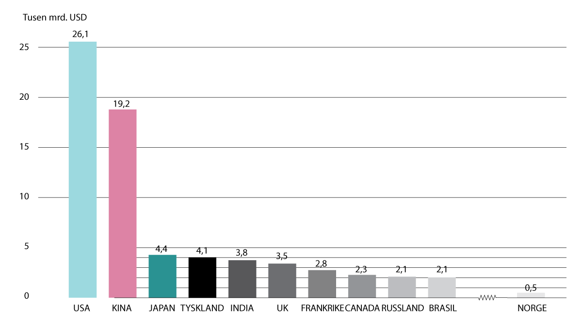 Figur 4.7 Kina utfordrer USAs dominans i internasjonal politikk. Denne grafen viser verdens 10 største økonomier målt i tusen milliarder amerikanske dollar ved begynnelsen av 2023. Ingen land er på nivå med USA og Kina. Norge er inkludert for sammenligning.