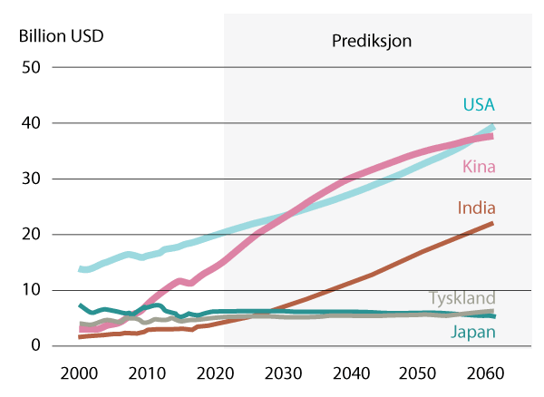 Figur 4.8 USA og Kinas anslåtte BNP i milliarder dollar. Det er krevende å si om eller når Kina vil gå forbi USA. Denne modellen viser at Kina og USA vil være de to dominerende økonomiske supermaktene i årene som kommer, med omtrent samme økonomiske størrelse. Denne økonomiske maktfordelingen danner grunnlaget for en rivalisering som vil prege internasjonal politikk.