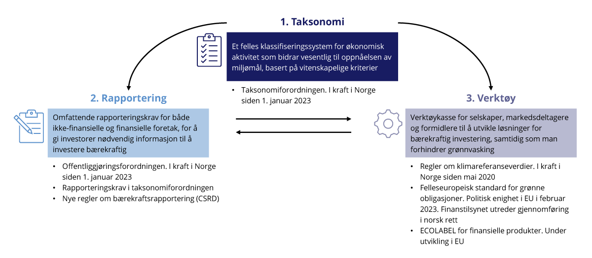 De ulike EU-reglene som inngår i handlingsplanen for bærekraftig finans, gjennomføres fortløpende i norsk rett etter å ha blitt innlemmet i EØS-avtalen. Taksonomiforordningen og offentliggjøringsforordningen er gjennomført i norsk rett ved inkorporasjon i lov om offentliggjøring av bærekraftsinformasjon i finanssektoren og et rammeverk for bærekraftige investeringer (lov om bærekraftig finans). Rapporteringsplikten etter taksonomiforordningen artikkel 8 er i tillegg gjennomført ved endring i regnskapsloven § 3-3 c tiende ledd. Både loven om offentliggjøring av bærekraftsinformasjon i finanssektoren og et rammeverk for bærekraftige investeringer, og endringen i regnskapsloven § 3-3 c tiende ledd, trådte i kraft 1. januar 2023. Ettersom loven som gjennomfører taksonomiforordningen først trådte i kraft 1. januar 2023, var det ikke krav om taksonomirapportering i Norge for regnskapsårene 2021 og 2022, slik tilfelle var i EU. Finansdepartementet oppfordret imidlertid norske foretak som vil omfattes av rapporteringspliktene, til å inkludere taksonomirelatert informasjon i sine årsberetninger for regnskapsårene 2021 og 2022 på frivillig basis.