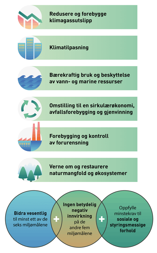 Taksonomiforordningen artikkel 9 fastsetter seks klima- og miljømål, se figur 2.4. Dette er de samme klima- og miljømålene som det skal rapporteres om etter regnskapsdirektivet ny artikkel 29b nr. 2 som er innført med CSRD, se omtale av de nye rapporteringsstandardene i utredningen kapittel 4.3.2.2. For at en aktivitet skal kunne regnes som bærekraftig etter taksonomien må den bidra vesentlig til oppnåelsen av minst ett av målene, og ikke ha betydelig negativ innvirkning på de øvrige målene. I tillegg må aktiviteten oppfylle minstekrav til sosiale og styringsmessige forhold. EU-kommisjonen skal fastsette nærmere kriterier for når ulike økonomiske aktiviteter kan defineres som bærekraftige, i delegerte forordninger.