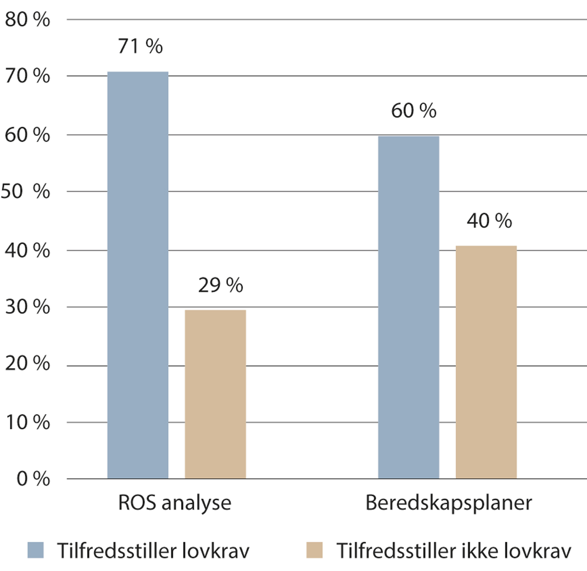 Statsforvalteren fører tilsyn med kommunenes oppfølging av både helseberedskap og den kommunale beredskapsplikten.11 Når det gjelder kommunal beredskapsplikt har flere statsforvaltere gitt innspill til kommisjonen om at tilsynene viser at mange kommuner svikter på det systematiske arbeidet med samfunnssikkerhet og beredskap. Flere kommuner har for lite kompetanse og kapasitet til å utarbeide helhetlige risiko- og sårbarhetsanalyser (ROS-analyser) med tilstrekkelig bredde og dybde. Ulikheter mellom kommunene i størrelse og administrativ kapasitet fører til at det er store variasjoner i hvor mange årsverk den enkelte kommune kan avsette til beredskapsrelaterte oppgaver. Menon Economics har gjennomført en kartlegging av kommunenes oppfyllelse av lovpålagte oppgaver for Generalistkommuneutvalget.12 Kartleggingen viste at det i 2021 var 29 prosent av kommunene som ikke tilfredsstilte lovkrav om å ha en oppdatert ROS-analyse og 40 prosent som ikke tilfredsstilte lovkrav om å ha en oppdatert beredskapsplan, se figur 5.3.