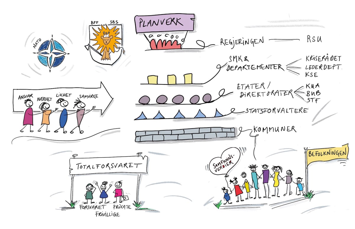 Regjeringen har det øverste utøvende ansvaret både for den militære og sivile beredskapen i fredstid og for håndteringen av kriser og væpnet konflikt. Ansvaret for forebygging, beredskapsforberedelser og kompetanse til krisehåndtering er i stor grad tillagt det enkelte departementet, deres underlagte virksomheter og kommunene.1 Den akutte håndteringen av uønskede hendelser for å redde liv og helse gjennomføres i hovedsak av de tre nødetatene, brann- og redningsvesenet, helsetjenesten og politiet. I tillegg håndterer den offentlig organiserte redningstjenesten søk- og redningsaksjoner. Andre hendelser som rammer viktige samfunnsverdier både forebygges og håndteres av virksomheter i de ulike samfunnssektorene. For eksempel har Norges vassdrags- og energidirektorat (NVE) et beredskapsansvar for både naturhendelser som skred og for kraftforsyningsberedskapen. I beredskapsarbeidet og håndteringen innenfor alle sektorer kan både private, frivillige og offentlige aktører ha sentrale roller.