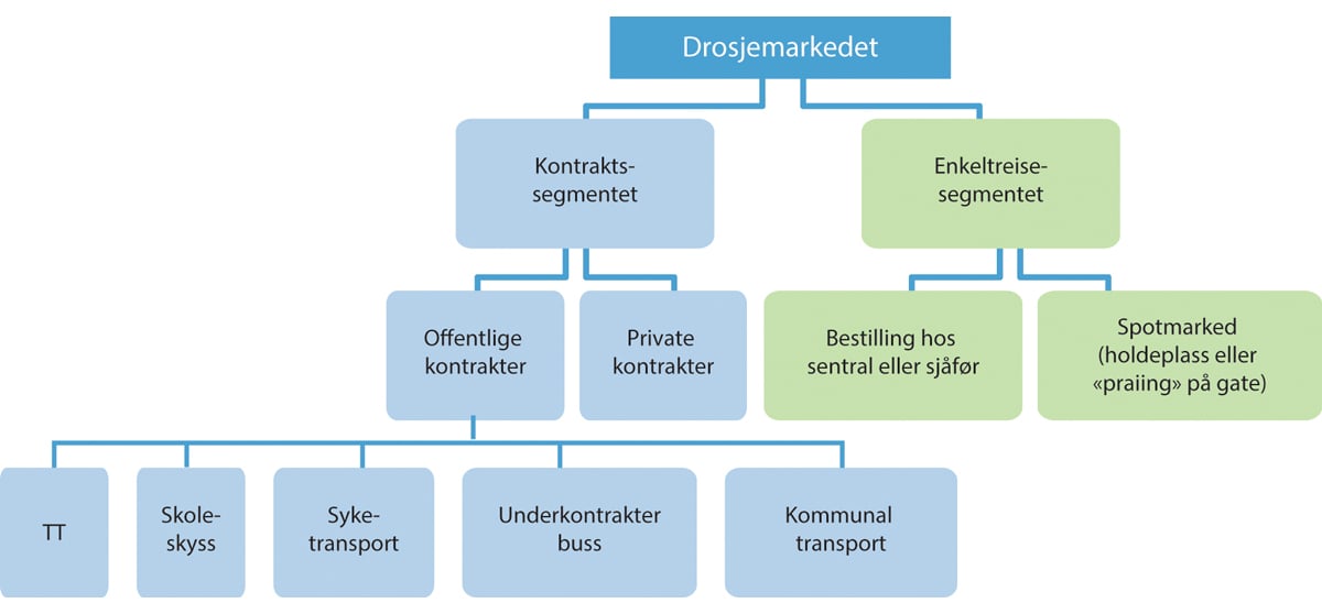 Drosjemarkedet består av en rekke delmarkeder, med ulike egenskaper avhengig av flere forhold på tilbuds- og etterspørselssiden. Markedssegmentene og tjenestene er illustrert i figur 6.1. I hovedsak kan man skille mellom kontraktkjøring og enkeltturer.