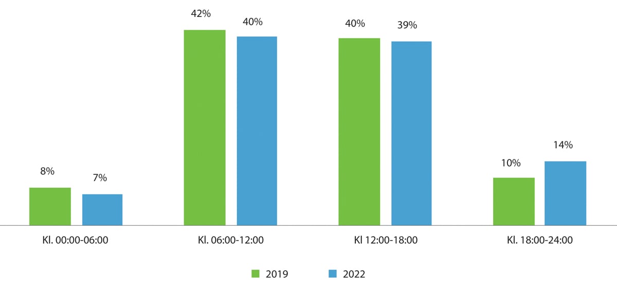 Figur 6.3 Løyvehavernes oppfatning av hvordan turene til drosjetjenesten fordelte seg over døgnet på hverdager i 2022.