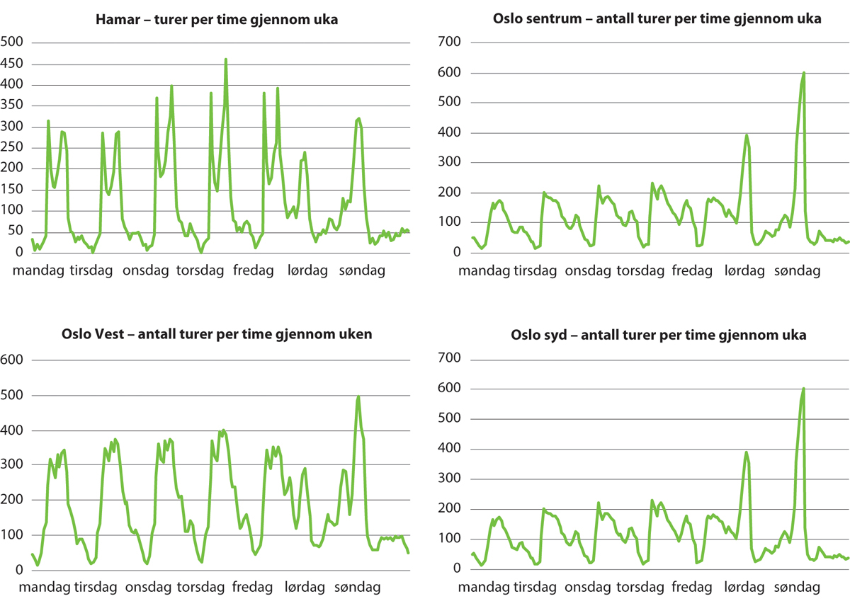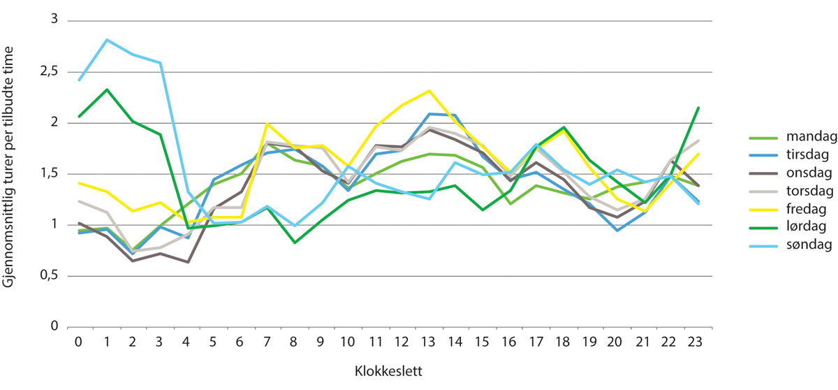 Variasjonen i etterspørselen er stor, både gjennom døgnet og uka, og mellom ulike lokaliteter. Et hovedmønster er mye kjøring i morgen og ettermiddagsrush, og mindre kjøring på kveld, og natt. I småbyer, som Hamar, er det tydeligere rushtidstopper enn i større byer som Oslo. Dette henger antagelig sammen med at en større andel av trafikken er knyttet opp til kontrakter, særlig skolekjøring, som i hovedsak finner sted i rushtiden (jf. Leiren, mfl., 2014). Det er også betydelig forskjell internt i en by, som Oslo, mellom sentrum, hvor en vesentlig større andel av kjøringen foregår natt til lørdag, og søndag, og Oslo syd, hvor mønsteret ligner mer på det man finner i Hamar.