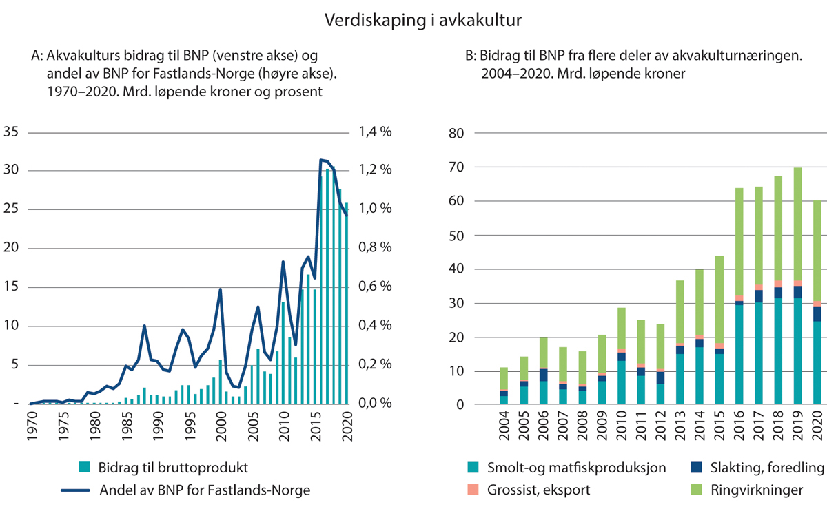 Figur 4.1A viser at akvakulturnæringen har hatt en betydelig vekst både målt ved nivå på bruttoproduktet fra næringen og som andel av BNP for Fastlands-Norge. I 2019 var næringens samlede bruttoprodukt på om lag 28 mrd. kroner, som tilsvarer om lag 1 pst. av BNP for Fastlands-Norge.
