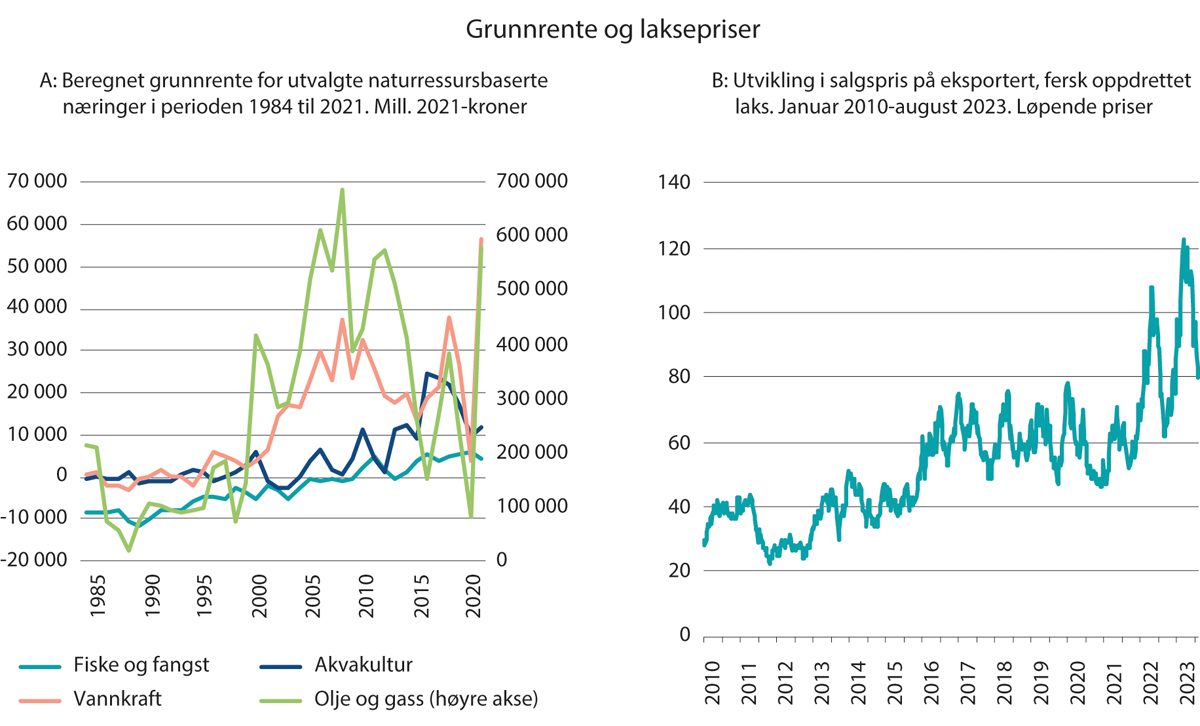 Figur 4.2A viser utviklingen i beregnet, realisert renprofitt i perioden 1984-2021 for noen utvalgte naturressursbaserte næringer fra Statistisk sentralbyrås rapport Ressursrenten i naturressursnæringene i Norge 1984–2021 (Greaker og Lindholt, 2022). Rapporten viser at grunnrenten i akvakultur har steget markant fra 2012, og i perioden 2016 til 2018 har den vært på i overkant av 20 mrd. kroner. I 2020 og 2021 er grunnrenten, definert som all renprofitt, beregnet til henholdsvis 9,6 og 11,8 mrd. kroner. Statistisk sentralbyrå viser til Fiskeridirektoratets lønnsomhetsundersøkelser og forklarer fallet fra 2018 til 2020 med lavere laksepriser og økte kostnader. Samlet falt salgsprisen per kilo med drøye 6 pst., mens kostnadene økte med 4,5 pst. per kilo produsert laks. Noe av dette kan trolig tilskrives koronapandemien. Grunnrenten økte noe igjen i 2021 som følge av økt omsatt mengde. I 2022 lå prisene på laks om lag 40 pst. høyere enn i 2021. Det tyder på at grunnrenten i 2022 var betydelig høyere.