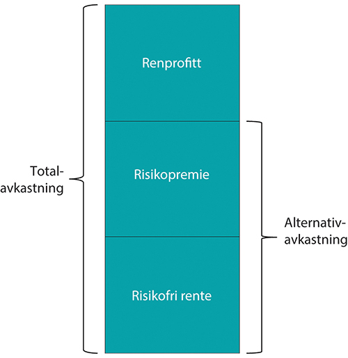 Synstolking: Figur 4.3 viser tre bokser som er stablet i høyden. På den øverste boksen står det «renprofitt», på den midterste boksen står det «risikopremie», og på den nederste boksen står det «risikofri rente». Det peker en pil fra alle tre boksene til venstre på ordet «totalavkastning». Det peker en pil fra boksene i midten (risikopremie) og nederst (risikofri rente) til høyre på ordet «alternativavkastning».