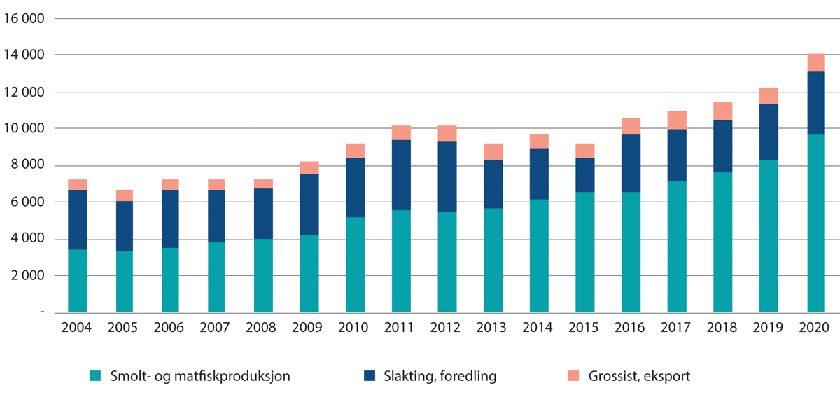 Akvakulturnæringen er lite arbeidsintensiv og sysselsetter relativt få personer sammenlignet med andre næringer. I 2020 sysselsatte akvakulturnæringen i underkant av 10 000 personer i smolt- og matfiskproduksjon, se figur 4.4. Av disse var hoveddelen tilknyttet produksjon av laks og regnbueørret (Fiskeridirektoratet, 2022). Arbeidstakernes andel av verdiskapingen i akvakulturnæringen har falt over tid, og gått fra over 70 pst. i flere perioder på 1980-tallet til under 20 pst. i 2017. Dette skyldes at næringen har blitt mer kapitalintensiv, samtidig som at de høye prisene har økt verdien av produksjonen. Akvakulturnæringen skaper i tillegg en rekke ringvirkninger og gir opphav til sysselsetting innen andre næringer i Norge og i utlandet. Mye er lokale ringvirkninger langs kysten, blant annet gjennom verdiskaping fra leverandør- og verftsindustrien, fôrfabrikker, bearbeidingsindustrien, brønnbåtvirksomhet, servicetjenester på land og til havs, transport mv. Akvakulturvirksomhet kommer hele landet til gode gjennom inntekter til fellesskapet, se punkt 4.3 under.