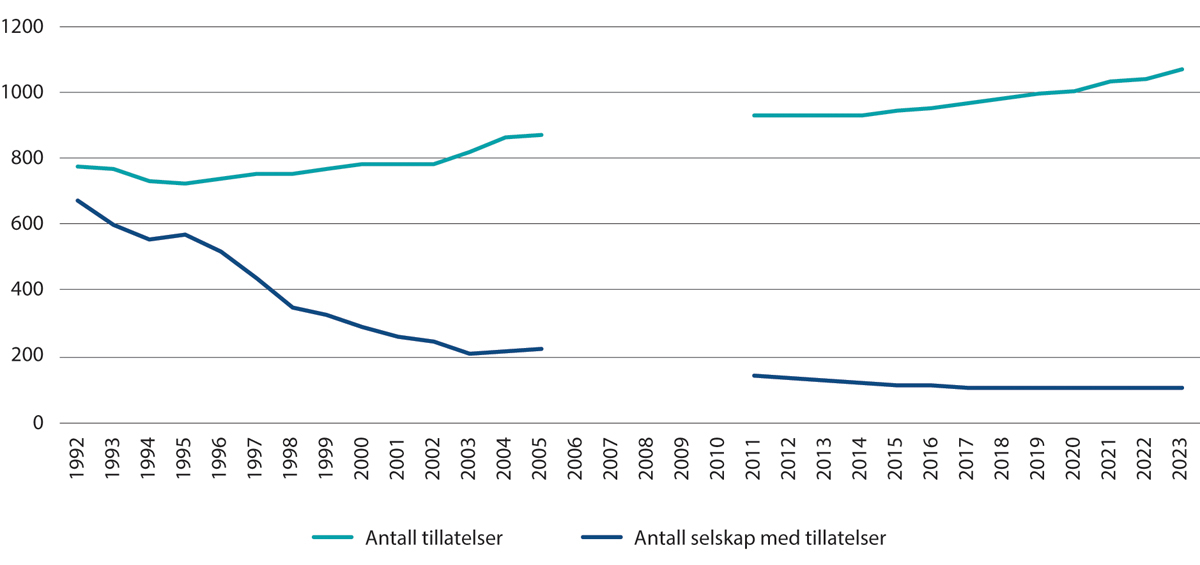 Figur 4.5 Utvikling i antall matfisktillatelser og selskaper med tillatelse1
