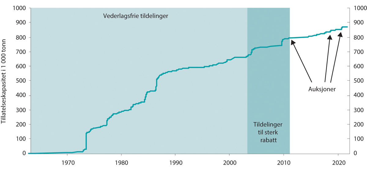Ifølge havbruksskatteutvalget hadde samlet tillatelseskapasitet per 2019 en markedsverdi på i størrelsesorden 200 mrd. kroner. Til sammenligning utgjorde de samlede beløpene næringen har betalt til det offentlige i vederlag for tillatelser i underkant av 7 mrd. kroner i nåverdi, det vil si om lag 3 pst. av verdien på tillatelsene.2 Figur 4.6 viser samlet tildelt kapasitet i tillatelsene fra 1963 til 2022. Størstedelen av tillatelsene har vært tildelt gratis eller til en lav pris. Markedsverdien på tillatelsene har steget i takt med den økende lønnsomhet i næringen, og mange tillatelser har blitt videresolgt til langt høyere priser enn vederlaget som ble betalt inn til myndighetene (Andreassen og Robertsen, 2014).