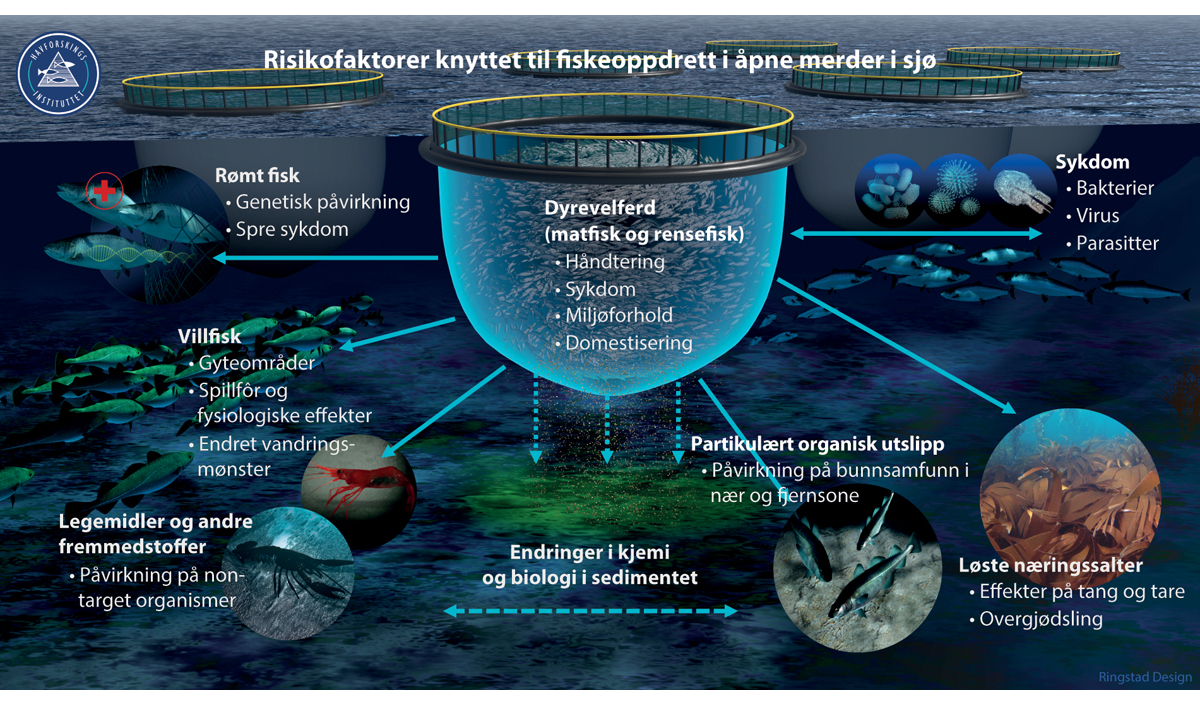 Synstolking: Figur 4.8 er en illustrasjon av hvordan akvakultur i åpne merder påvirker miljøet. I midten av bildet er det tegnet en merd med piler til illustrasjonsbilder av fisk, krepsdyr havbunn og andre akvatiske organismer. På de ulike illustrasjonsbildene står følgende overskrifter (med stikkord under); rømt fisk, villfisk, legemidler og andre fremmedstoffer, endringer i kjemi og biologi i sedimentet, fôrspill og fekalier, løste næringssalter, sykdom.