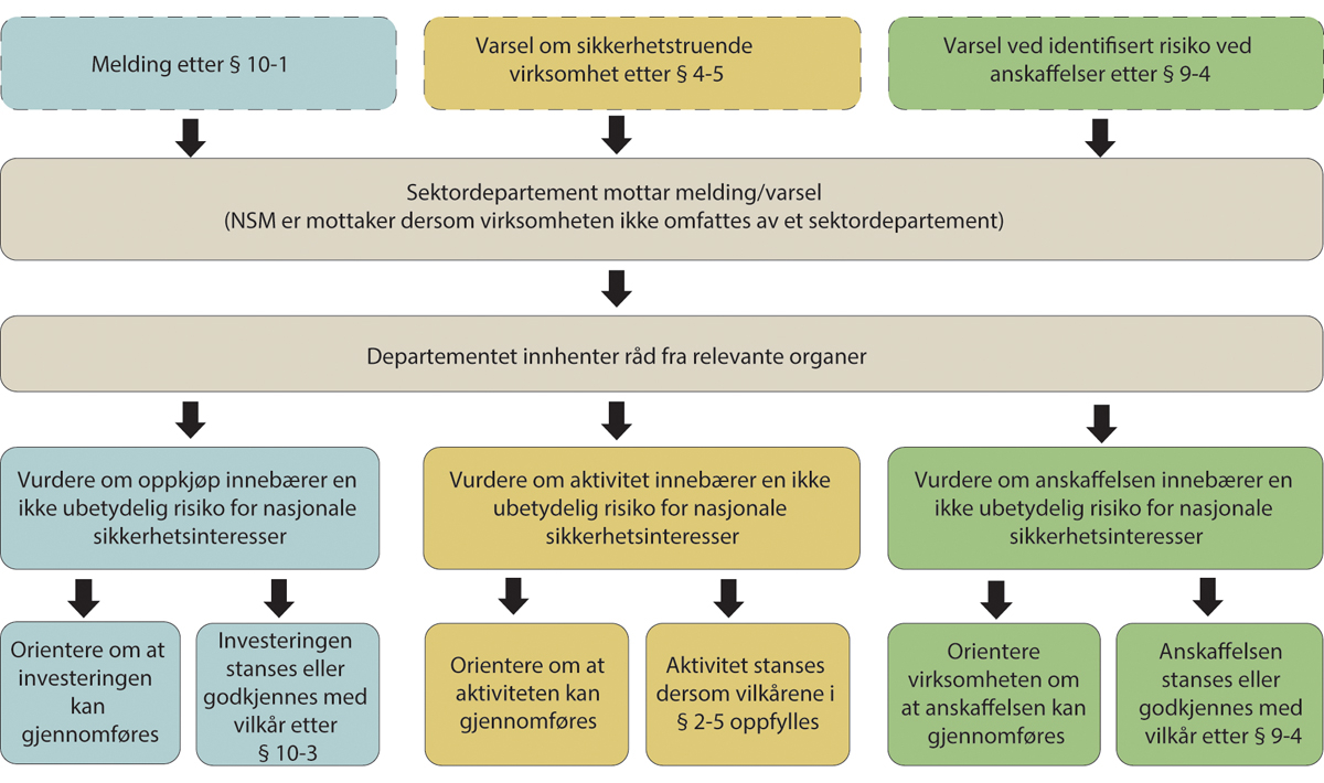 Investeringer som er omfattet av meldeplikten i sikkerhetsloven kapittel 10, skal meldes til ansvarlig sektordepartement. I tilfeller hvor foretaket ikke omfattes av noe departements ansvarsområde skal meldingen sendes til NSM. Andre varsler om sikkerhetstruende investeringer kan rettes til enten sektordepartementet, sektortilsyn eller NSM. Alle saker hvor det er aktuelt med inngrep etter § 10-3 eller § 2-5 skal behandles på departementsnivå.