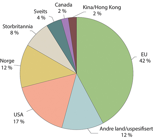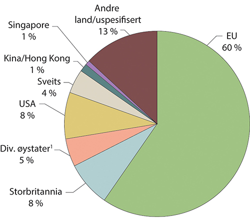 Omtrent 60 prosent av direkteinvesteringene i Norge (beholdning) kommer fra investorer i EU, og blant disse var Sverige desidert størst. Utenfor EU er Storbritannia, USA, Sveits og diverse øystater relativt store investorer i Norge. Direkteinvesteringene fra relativt store globale økonomier som India, Singapore og Kina med Hong Kong utgjør en forholdsvis liten andel. Se figur 4.2.
