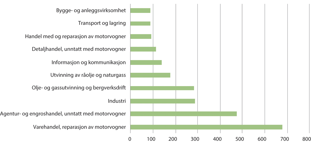En stor andel av de utenlandskontrollerte foretakene eies fra Sverige og Danmark. Utenlandskontrollerte foretak har størst omsetning innenfor agenturvirksomhet og industri, og stor omsetning innenfor olje- og gassutvinning og bygg- og anleggsvirksomhet. Se figur 4.4.