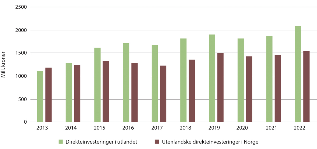 I 2013 var beholdningen av direkteinvesteringer i Norge noe større enn beholdningen av norske direkteinvesteringer i utlandet. Fra 2014 har størrelsesforholdet snudd, og beholdningen av norske direkteinvesteringer i utlandet er markant større enn beholdningen av utenlandske direkteinvesteringer i Norge.