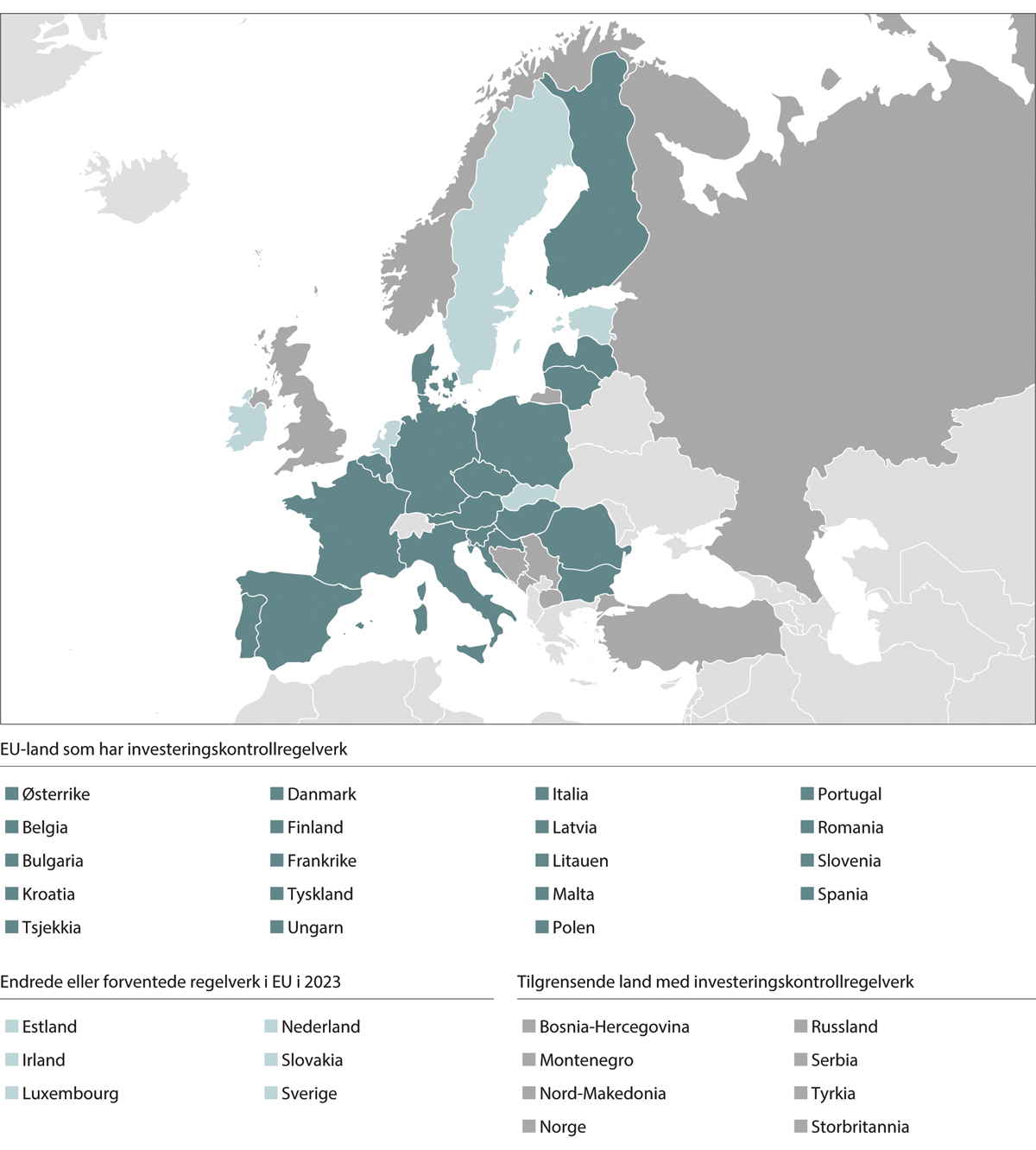 Norge er et relativt åpent land for utenlandske investeringer. På skala for regulatorisk åpenhet utarbeidet av Organisasjonen for økonomisk samarbeid og utvikling (OECD), hvor 0 er helt åpent og 1 er helt lukket, ligger Norge på 0,09. Dette er om lag som gjennomsnittet for åpenhet blant OECD-land. Også andre land i Nord-Europa er relativt åpne for utenlandske investeringer. Sverige ligger for eksempel på 0,06, Storbritannia på 0,04 og Danmark på 0,03 (OECD, 2023a).