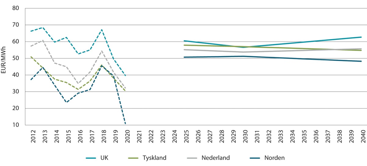 Både Statnetts og NVEs analyser viste at prisen i Norden i gjennomsnitt ville ligge på et lavere prisnivå enn i Europa, både i 2030 og 2040. I figur 11.10 vises kraftprisen i Norden, Storbritannia, Tyskland og Nederland for perioden 2010 til 2020, og NVEs simuleringer av fremtidige priser i de samme landene.