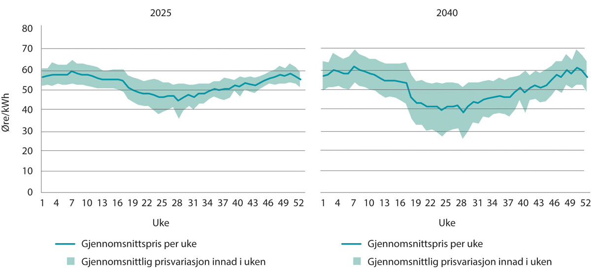 Til venstre i figuren vises sesongvariasjonene i 2025, og til høyre vises variasjonene i 2040. Den heltrukne linjen viser ukentlige kraftpriser, mens utfallsrommet rundt linjen viser den forventede gjennomsnittlige prisvariasjonen for 30 værår. Utfallsrommet beskriver ikke ekstremtilfeller, som for eksempel nullpriser i enkelttimer om sommeren. Det er fordi figuren viser gjennomsnittlig ukesvariasjon. NVEs simuleringer viser at kraftprisene fremover vil variere mer både fra dag til dag, fra sesong til sesong og fra år til år. Prisen vil være høyest og prisvariasjonen størst om vinteren.