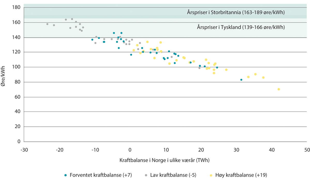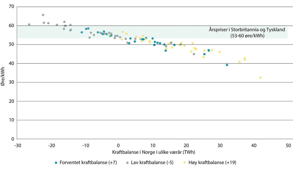 Figur 11.13 viser beregnede gjennomsnittlige årspriser i 2030 i Norge ved ulike forutsetninger om kraftbalansen. Grå prikker representer en kraftbalanse i et normalår på minus 5 TWh, blå prikker representerer forventet positiv kraftbalanse på 7 TWh, og gule prikker representerer en kraftbalanse på 19 TWh. Se også figur 11.3 for illustrasjon av de ulike kraftbalansescenariene. For hver underliggende kraftbalanse i et normalår er det 30 prikker som representerer et simulert værår og hvordan det slår ut i pris gitt de ulike kraftbalansene. Det lyseblå skraverte feltet viser spennet i den forventede kraftprisen i Tyskland og Storbritannia for ulike år. Det er en klar sammenheng mellom kraftbalansen og kraftprisen: jo lavere nasjonal kraftbalanse, desto høyere priser.
