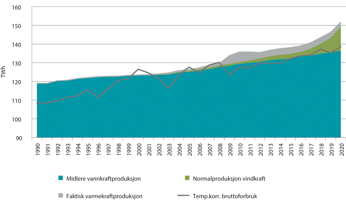 Det er store variasjoner i kraftbalansen fra år til år. Forbruket varierer med temperaturene og kraftproduksjonen varierer med tilsig og vindforhold. Investeringer på produksjonssiden og utviklingen på forbrukssiden har stor betydning for kraftbalansen. Norge er i dag nettoeksportør av kraft i normale år. Figur 11.2 viser utviklingen i kraftbalansen fra 1990 til 2020. Den mørke grå linjen viser temperaturkorrigert forbruk, mens den norske produksjonsevnen i et normalår vises i blått, grått og grønt. Den norske kraftbalansen er differansen mellom disse. Kraftoverskuddet sank i Norge fra 1990 mot 2000-tallet. Investeringer i vind- og varmekraft bidro til at det senere bygde seg opp et betydelig kraftoverskudd, til tross for at forbruket økte. I 2021 var kraftoverskuddet om lag 20 TWh.