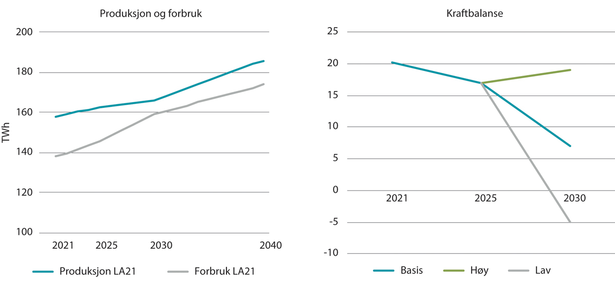 I sin 2021-analyse forventet NVE at kraftforbruket frem mot 2030 ville øke mer enn kraftproduksjonen, og at Norge dermed ville få en strammere kraftbalanse. Denne vurderingen ble delt av Statnett (2021) og Multiconsult og Thema (2022). I Statnetts siste kortsiktige markedsanalyse anslås Norge å få en negativ kraftbalanse i 2027 (Statnett, 2022). Uten ny produksjon kan underskuddet bli enda større om ikke forbruket reduseres på grunn av høyere priser i Norge enn i våre naboland. Statnett forventer at situasjonen vil snu til et overskudd på kraftbalansen etter hvert som det kommer inn betydelig mer kraftproduksjon lengre fram i tid.