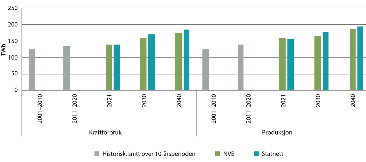 Både NVE og Statnett finner at det vil være et kraftoverskudd i 2030, men på ulike premisser blant annet om klimapolitikken og kraftutbygging. Normalårsproduksjonen er av NVE beregnet til om lag 157 TWh i 2022, se kapittel 5. I Statnetts analyse ventes det en økt kraftproduksjon på om lag 18 TWh i 2030, mens NVEs analyse gir en økt produksjon på om lag 9 TWh. Det er vindkraftproduksjon som utgjør størst forskjell mellom NVEs og Statnetts analyser mot 2030. I kapittel 10 er det vist til at det med dagens gitte konsesjoner kan være mulig å bygge nye kraftverk som gir om lag 9 TWh kraftproduksjon innen 2030. Dette inkluderer vann- og vindkraft.