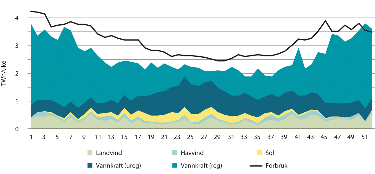 I et fornybart kraftsystem vil det være behov for at både produksjon og forbruk tilpasser seg periodene med lite sol og vind. Norge har et mye bedre utgangspunkt enn andre land fordi vannkraften er fleksibel med store lagringsmuligheter.