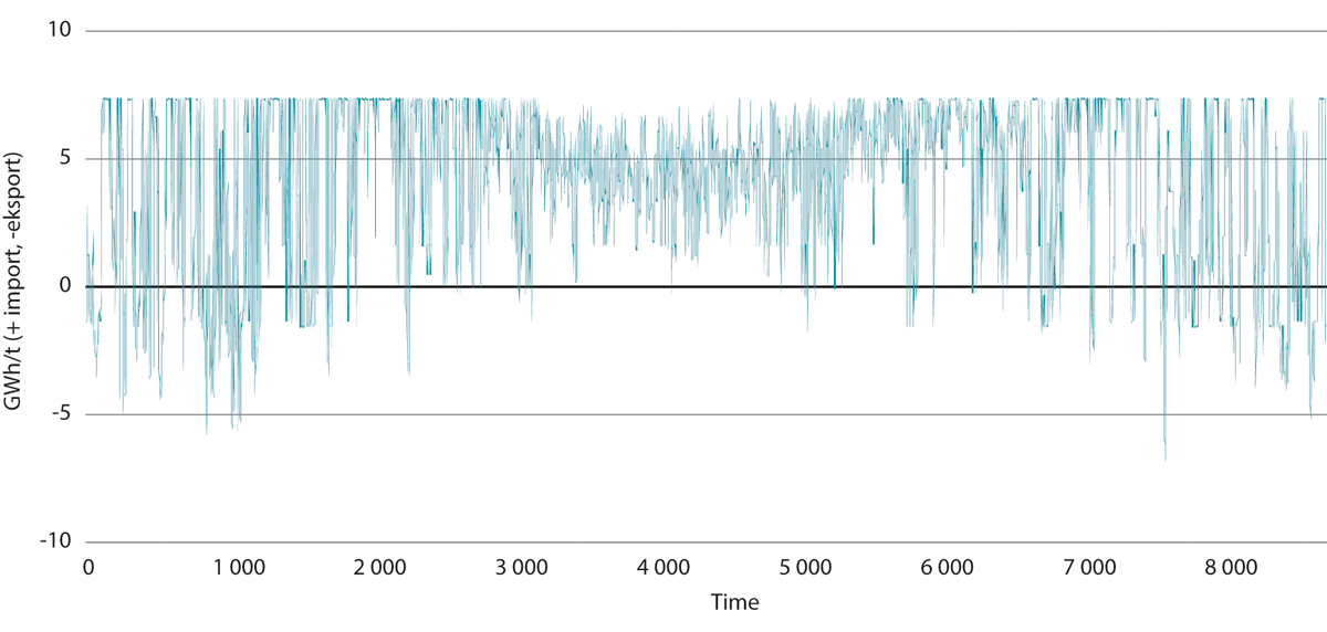 I simuleringene blir den maksimale importkapasiteten i et normalår bare benyttet 120 timer, og i et våtår blir den aldri benyttet. Timene med import fordeler seg gjennom året, og i alle ukene er det både timer med eksport og timer med import.