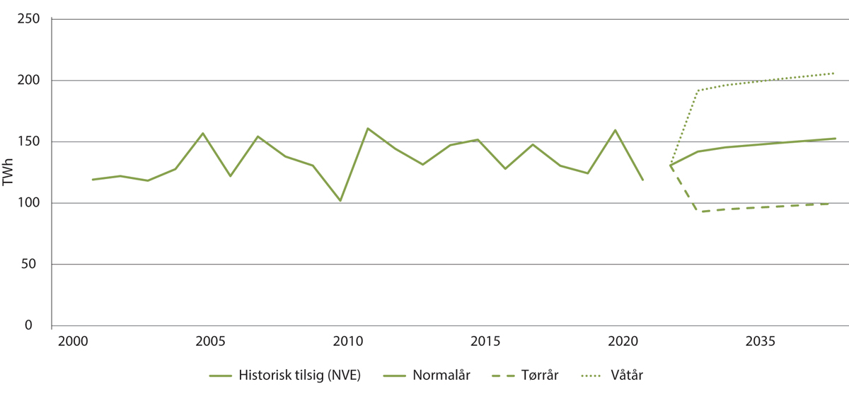 Fremover vil et varmere og våtere klima føre til at det samlede vanntilsiget i Norge øker. Økningen i tilsig blir størst om vinteren, mens tilsiget på sommeren blir redusert på grunn av mindre snø‐ og bresmelting. Mesteparten av økningen i tilsig kan utnyttes til vannkraftproduksjon (NVE, 2019). Det vil imidlertid kunne være store regionale forskjeller.