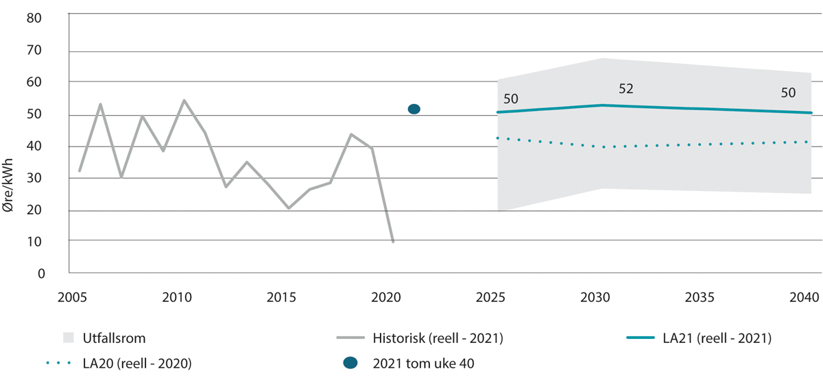 NVE anslo i sin langsiktige kraftmarkedsanalyse fra 2021 at prisene frem mot 2040 vil være betydelig høyere enn gjennomsnittet de foregående 20 årene. Bakgrunnen for dette var at de så for seg høyere CO2-pris og en økning i utvekslingskapasiteten mellom Sverige og Tyskland, og mellom Danmark og Storbritannia. Figur 11.8 viser til venstre historiske, årlige gjennomsnittspriser i Norge (grå linje). Til høyre viser figuren vektet gjennomsnittlig norsk kraftpris fra 2025 til 2040. Den heltrukne linjen er NVEs basisscenario i analysen i 2021 og den stiplede linjen er fra analysen i 2020. Utfallsrommet rundt basisbanen (skravert felt) følger av ulike antagelser om brensels- og CO2-priser. Alle priser er i 2021-kroner.