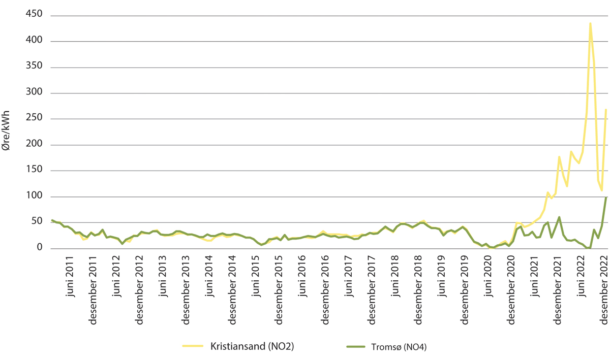 Både NVE og Statnett har lavere gjennomsnittspriser i Nord-Norge enn i Sør-Norge i sine analyser, og reduserte forskjeller mot 2040. Dette skyldes at nettkapasiteten nord-sør i Norge og Sverige ikke er høy nok til å utligne prisene. Det siste året har prisforskjellene mellom nord og sør vært betydelig større enn det vi har erfart tidligere, se figur 11.9. NVE skriver at «hvis prisnivået på kontinentet og Storbritannia øker, blir prisforskjellene mellom nord og sør i Norge større». NVEs og Statnetts analyser av prisforskjellene tok utgangspunkt i en normalsituasjon, ikke dagens ekstremsituasjon.