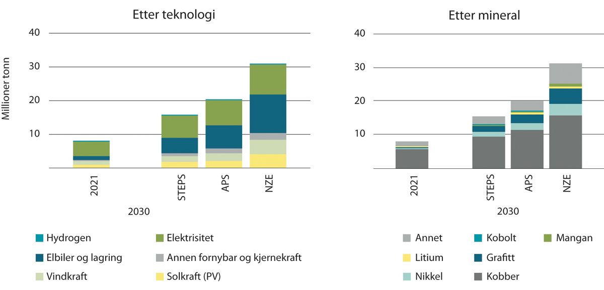 Figur 12.1 Scenarier for mineralbehov i 2030, fordelt på type mineral (høyre) og ulike teknologier (venstre)1