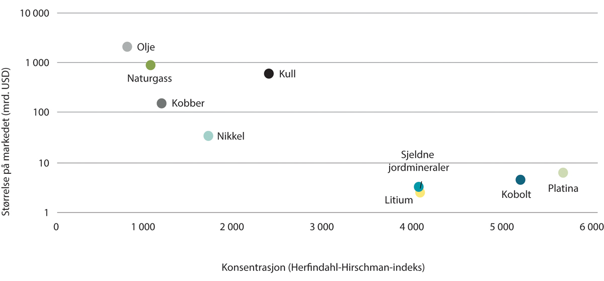 Metallene og mineralene som IEA antar vil prege fremtidens energiproduksjon, handles globalt. Dette er i seg selv ikke noe nytt, og gjelder også fossile brensler. Markedskonsentrasjonen for mineraler og metaller er likevel svært høy, også i forhold til fossile energikilder. Dette gjelder både for produksjon og for foredling, se figur 12.2 og 12.3.