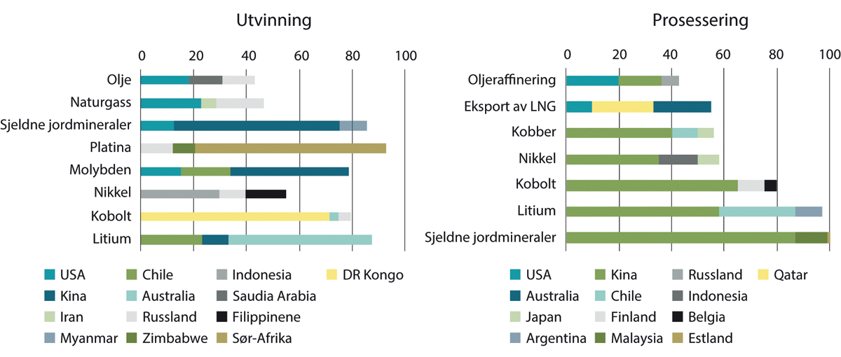 Figur 12.3 Ulike lands andel av utvinning (til venstre) og prosessering (til høyre) av utvalgte mineraler og fossile brensler, prosent i 2019