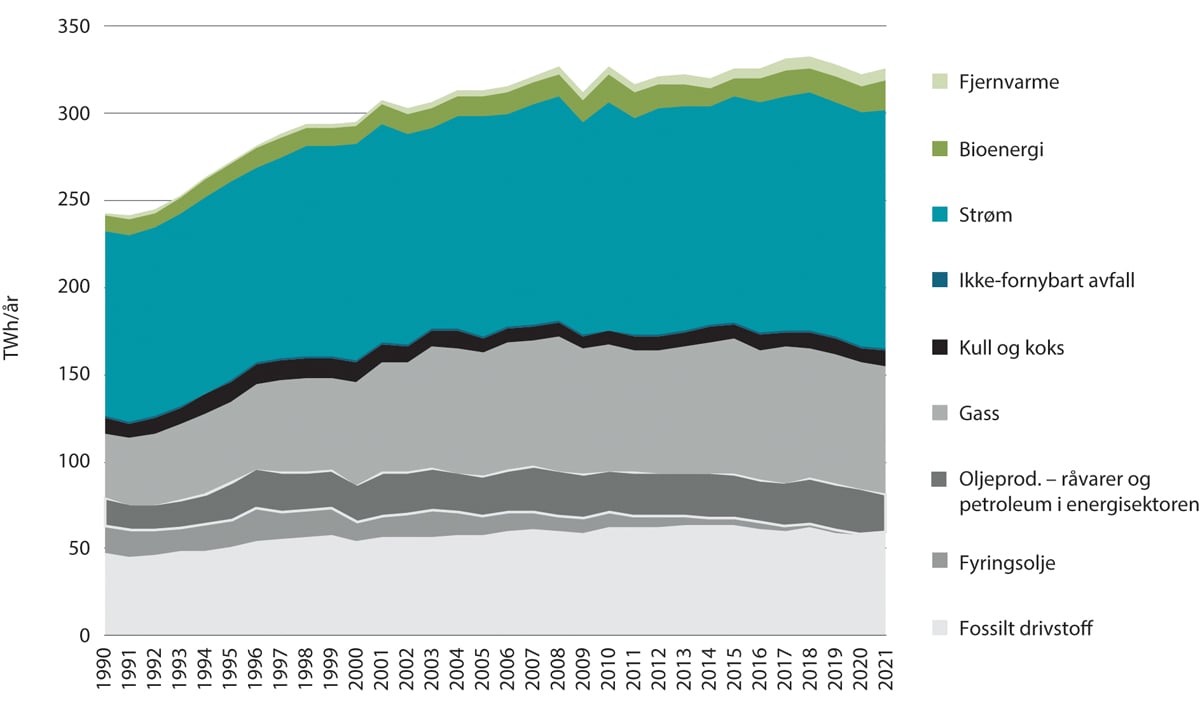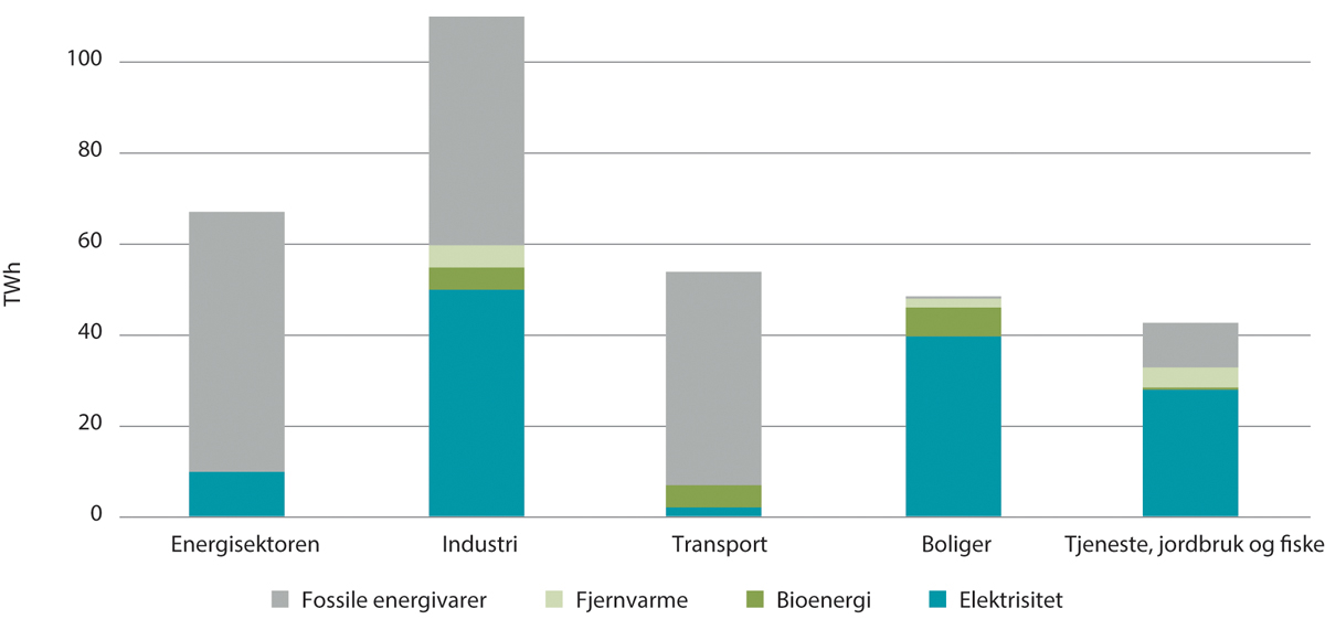 Den totale energibruken i Norge, inkludert sokkelen, var på 326 TWh i 2021 (SSB, 2022). Dette fordelte seg med 138 TWh elektrisitet, 165 TWh fossilt, 16 TWh bioenergi og rundt 7 TWh fjernvarme (som i vesentlig grad fyres med bioenergi).