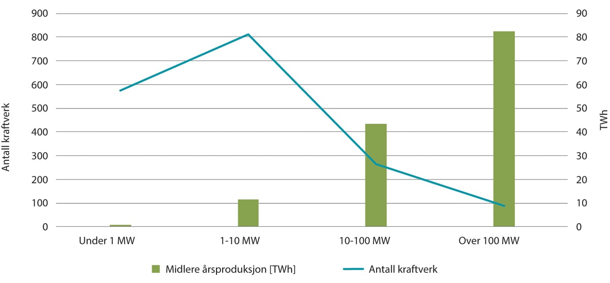 Selv om det er mange små kraftverk i Norge, står de største kraftverkene for mesteparten av produksjonen. De om lag 150 kraftverkene over 50 MW står for over 100 TWh av normalårsproduksjonen.